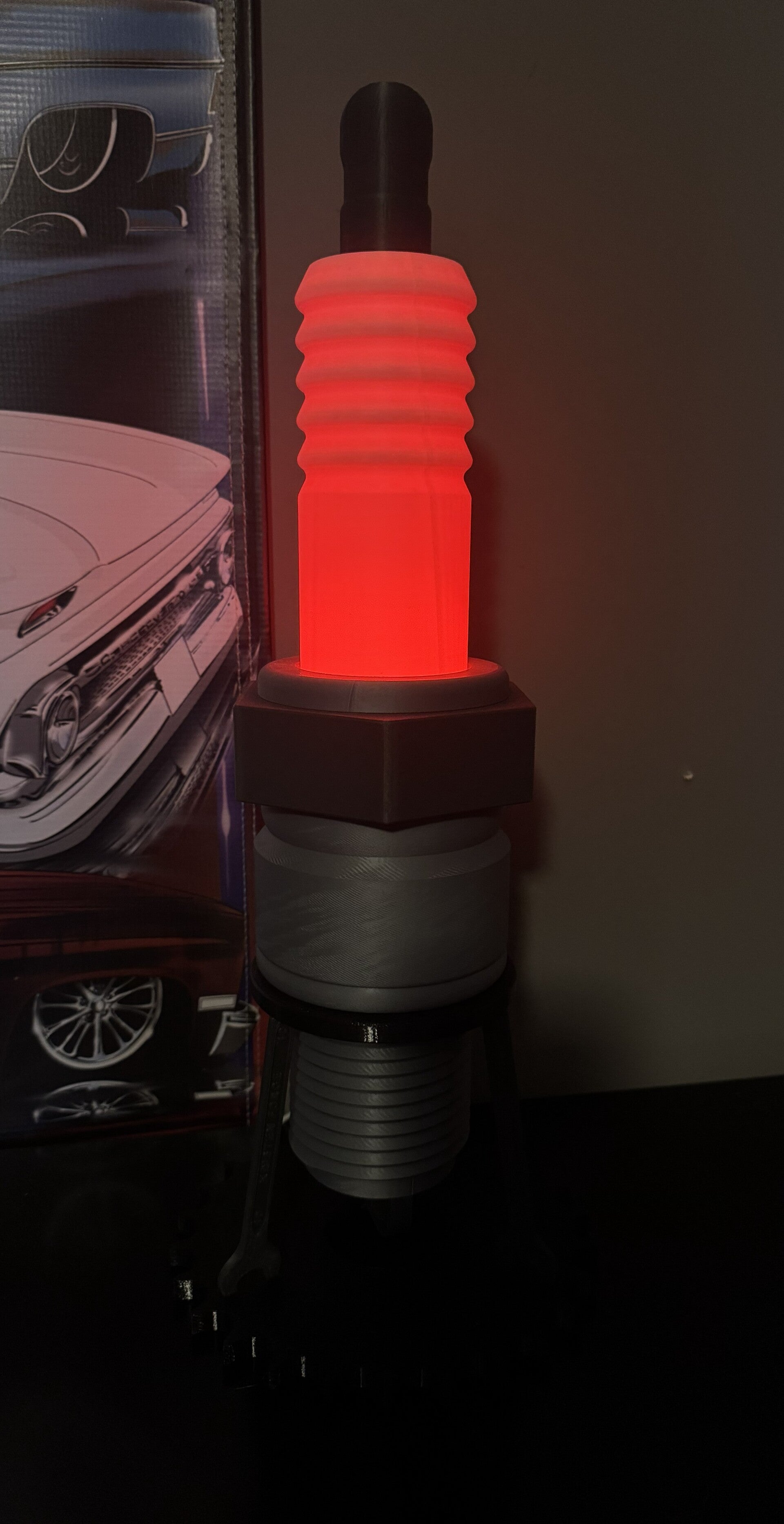 This 3d printed spark plug comes with a usb LED lamp kit with remote to change color. It will be perfect for any shop/garage/man cave. Measures 19 inches tall and a 8" sprocket base. Each major peice get screwed together for easy shipping and installation.